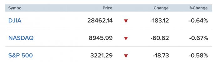 当地时间12月30日,尽管国际贸易谈判传出利好消息,但是有部分人士担忧美国总统特朗普或临阵“变卦”,美股未能延续涨势。截至收盘,道琼斯工业平均指数跌0.64%,报28462.14点;纳斯达克综合指数跌0.67%,报8945.99点;标普500指数跌0.58%,报3221.29点。