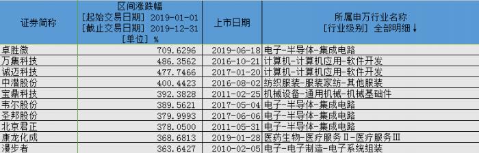 截至12月31日收盘,全年涨幅排名的10只个股中,计算机、电子行业个股独占七席。