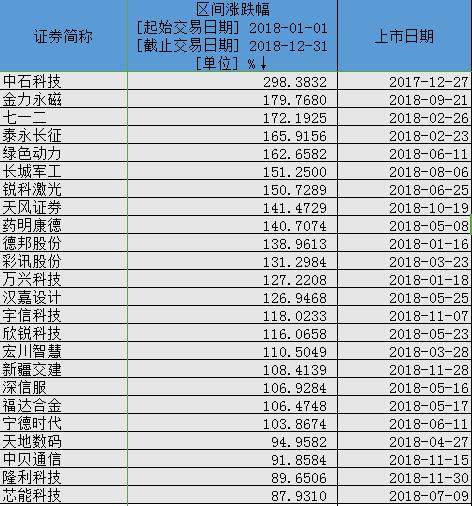 而在2018年,除了中石科技外,年度涨幅榜第2到24名,全部是当年上市的新股,这也是今年A股市场最为明显的一点变化。