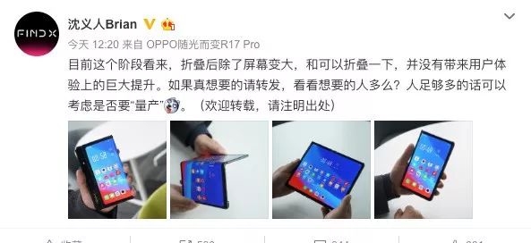 今年2月,OPPO副总裁沈义人在微博上晒出了OPPO的可折叠手机,不过他觉得,“可折叠手机除了屏幕变大,并没有给用户体验带来很大提升。”