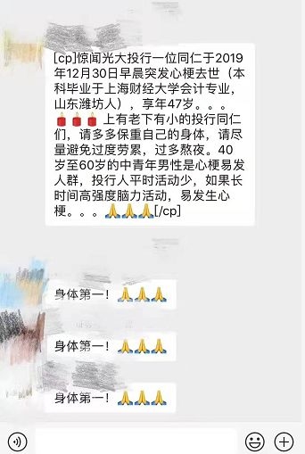 “上有老下有小的投行同仁们,请多多保重自己的身体,请尽量避免过度劳累,过多熬夜。40岁至60岁的中青年男性是心梗易发人群,投行人平时活动少,如果长时间高强度脑力活动,易发生心梗。”