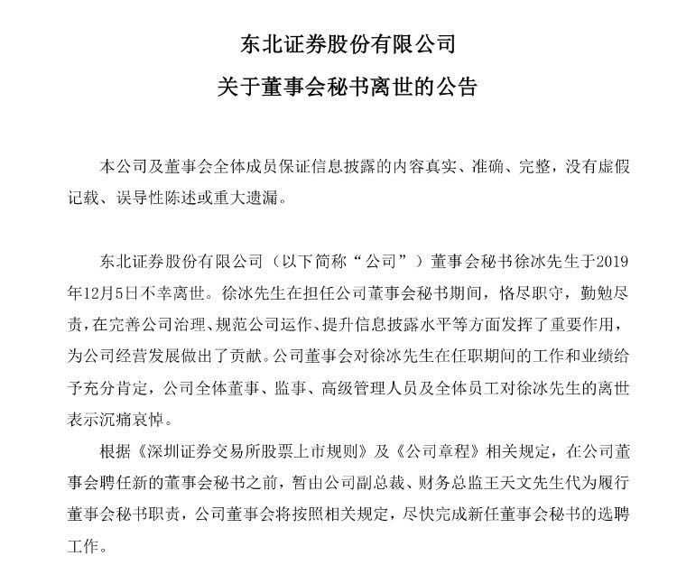 12月6日晚,东北证券公告表示,公司董事会秘书徐冰于12月5日不幸离世,享年55岁。