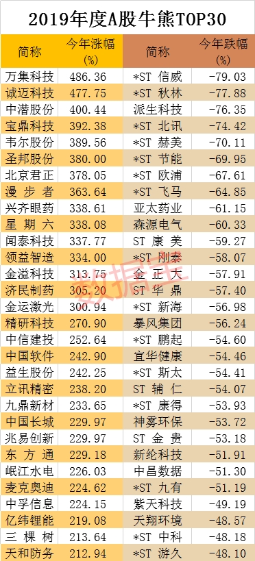 在年内跌幅榜中,业绩堪忧及爆雷股扎堆出现。数据显示,26股年内股价腰斩,*ST信威、*ST秋林、派生科技位居A股年度跌幅榜前三位,其中*ST信威累计跌幅79.03%,成为年度表现最差股票。*ST信威前三季度净利润亏损158.58亿元,成为同期A股亏损王。