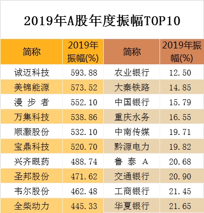 诚迈科技、美锦能源、漫步者、万集科技、顺灏股份等位居2019年度A股振幅榜前五位,其中诚迈科技今年振幅593.88%,排名A股振幅榜第一位!诚迈科技身兼华为概念、小米概念、芯片、操作系统等热门科技题材,12月19日盘中该股创下历史高点, 最新股价早已晋级百元股行列。