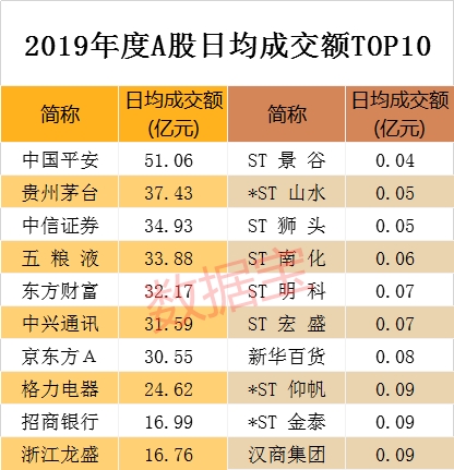 中国平安、贵州茅台、中信证券、五粮液、东方财富等行业龙头公司日均成交金额排名前五位,其中中国平安日均成交额51.06亿元排名A股日均成交额榜第一位!ST股票日均成交额普遍较低,其中ST景谷、*ST山水、ST狮头、ST南化、ST明科等日均成交额不足千万,ST景谷日均成交额最低,仅443万元。