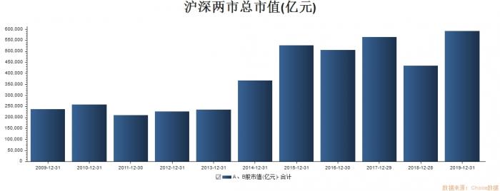 东方财富Choice数据显示,截至12月31日,沪深两市总市值为59.18万亿元,较2018年年末的43.32万亿元增加了15.86万亿元。