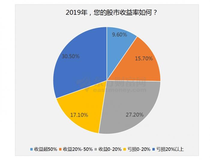 东方财富网12月底进行的网上调查显示,2019年盈利的股民仅52.5%,其中,9.6%盈利超50%;15.7%盈利介于20%-50%;27.2%盈利在20%以内。还有47.5%没有赚钱,其中更有30.5%的股民亏损在20%及以上。