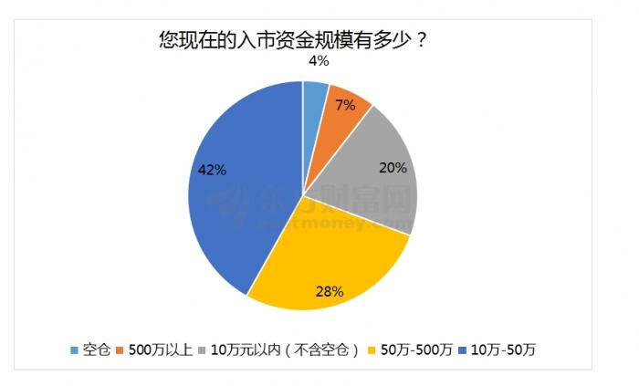 调查结果显示,62.1%的股民入市资金在50万元及以下,其中资金规模在10-50万之间的股民最多,占比为41.9%。此外,27.5%股民入市资金在50-500万之间,6.7%股民入市资金在500万元及以上。