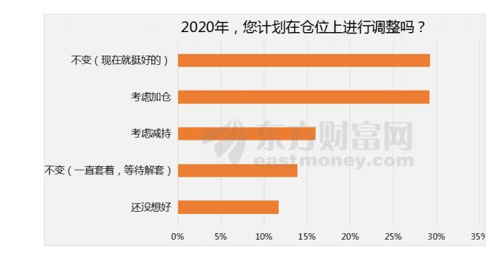 不过,考虑2020年加仓的投资者并不太多。调查显示,29.2%的股民表示2020年会考虑加仓,16%股民表示会考虑减仓。同时,有29.3%的股民称不进行仓位调整,觉得现在就挺好;另外有13.9%股民表示仓位不变,等待解套。