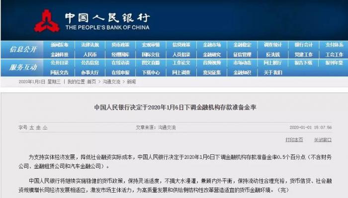 据央行网站1月1日消息,中国人民银行决定于2020年1月6日下调金融机构存款准备金率0.5个百分点(不含财务公司、金融租赁公司和汽车金融公司)。