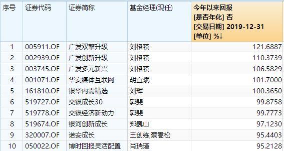 数据显示,共有广发双擎升级、广发创新升级、广发多元新兴、华安媒体互联网、银华内需精选5只基金2019年收益率超过100%。