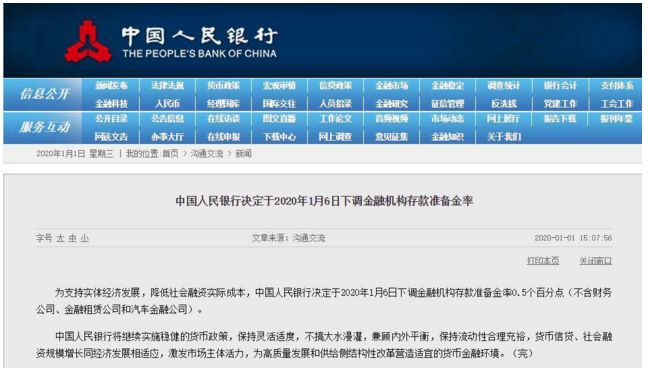 据央行网站1月1日消息,中国人民银行决定于2020年1月6日下调金融机构存款准备金率0.5个百分点(不含财务公司、金融租赁公司和汽车金融公司)。