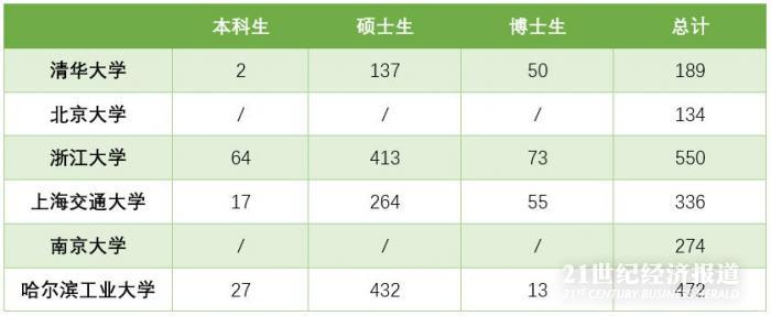 而根据21世纪经济报道记者此前的统计,2018年,华为在清华大学、北京大学、浙江大学、上海交通大学、复旦大学、中国科学技术大学、南京大学和哈尔滨工业大学8所高校招聘的毕业生人数为1682人。