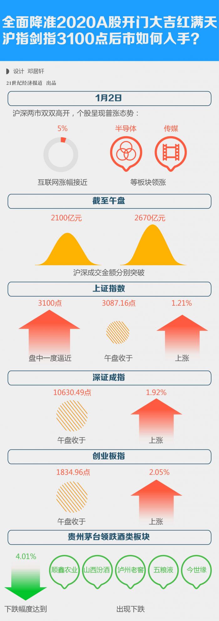 1月2日,沪深两市双双高开,个股呈现普涨态势,互联网涨幅接近5%,半导体、传媒等板块领涨。