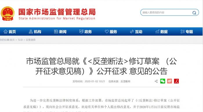 国家市场监管总局1月2日发布《<反垄断法>修订草案(公开征求意见稿)》,向社会公开征求意见。