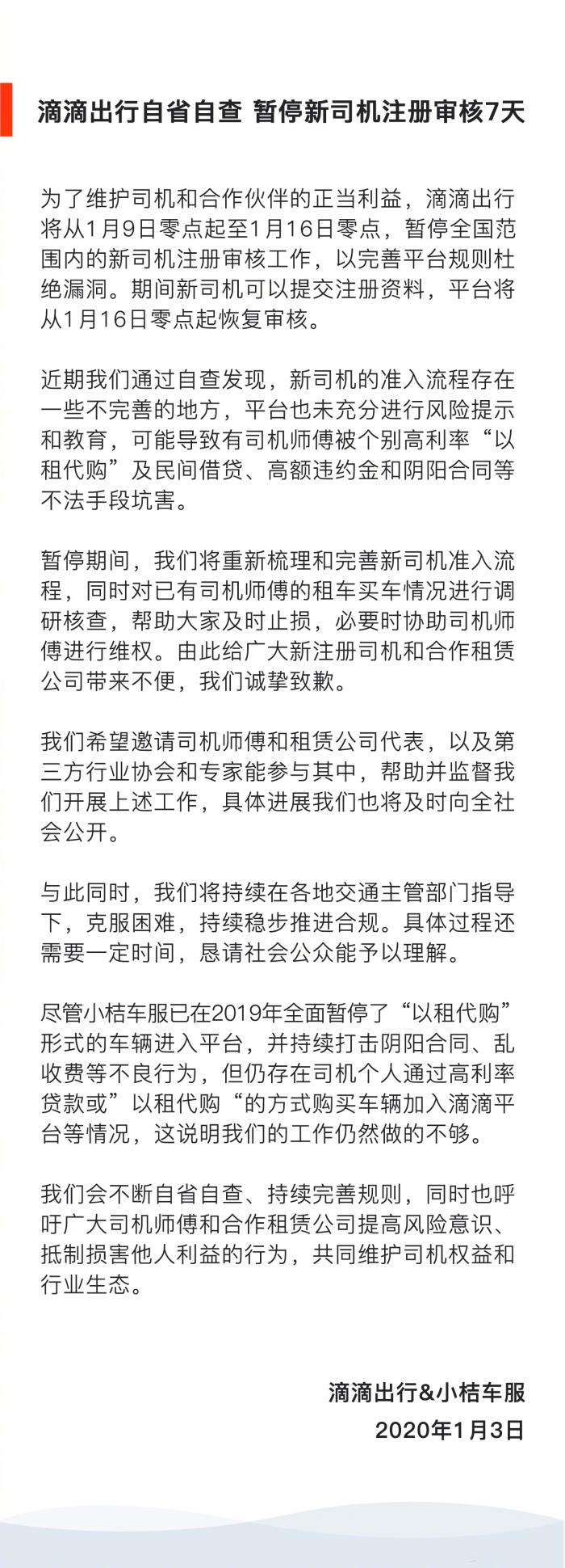 1月3日晚间消息,据滴滴出行微博公布消息,滴滴方面将进行自省自查,从1月9日零时起至1月16日零时,暂停新司机注册审核7天。