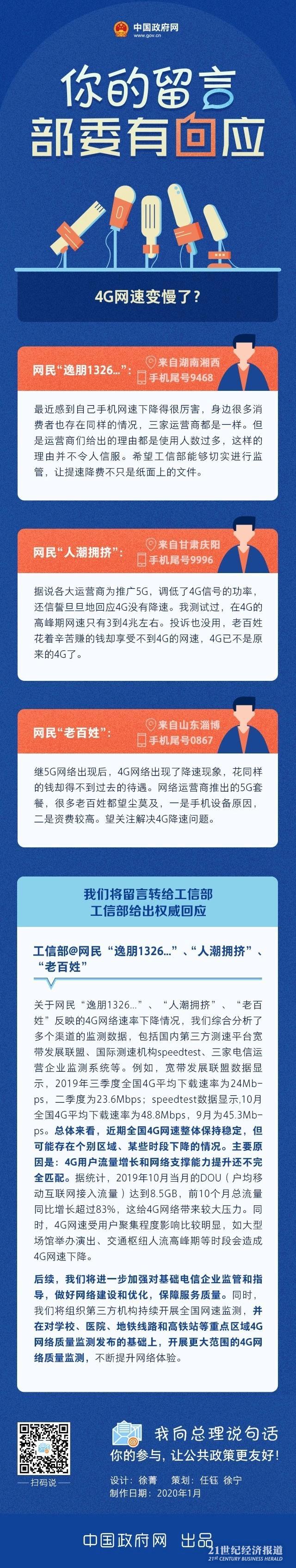 在中国政府网“你的留言部委有回应”中,针对上述网友的留言,工信部回应称,关于网民反映的4G网络速率下降情况,该部综合分析了多个渠道的检测数据,包括国内第三方测速平台宽带发展联盟、国际测速机构speedtest、三家电信运营企业检测系统等。