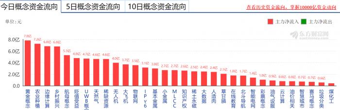金价上涨促使黄金概念股也是涨不能停。今日 ,黄金概念板块上涨2.66%,涨幅居前,其中金洲慈航涨停,荣华实业、山东黄金涨幅均超过5%。根据东方财富资金流统计,当日有7.8亿资金净流入黄金概念板块,为概念板块第一。