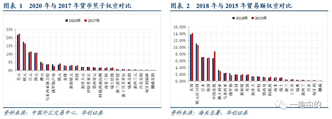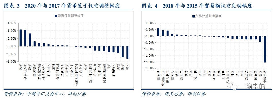 调整背景:此次调整为2017年以来第二次调整货币篮子权重。根据《CFETS人民币汇率指数货币篮子调整规则》,自2017年起交易中心将按年评估CFETS的货币篮子,根据情况适时调整篮子的构成或相关货币权重。2017年首次调整货币篮子,新增了11种货币,CFETS篮子货币数量由13种变为24种,并调整了各币种权重;2018、2019年均未重新调整货币篮子与权重;此次调整货币篮子权重为2017年以来第二次调整,仅对权重做出调整,而未调增货币篮子币种。调整理由:主要由于近年来贸易结构发生调整,为增强CFETS的代表性,因此相应调整权重。2017年版本的货币篮子权重参照2015年考虑转口贸易因素的贸易额,2020年版本则参照2018年考虑转口贸易因素的贸易额,而近几年中美贸易摩擦对中国的贸易结构产生了较大的影响。根据海关总署公布的进出口贸易额数据,我们对比了2015年与2018年的贸易额权重变化情况:欧元区、澳大利亚、俄罗斯、墨西哥等地的贸易额占比明显提升,而中国香港、阿联酋、南非、英国等地的贸易额占比则有所下降。此次CFETS币种权重的调整与贸易额权重的调整方向基本一致,主要还是出于增强货币篮子与贸易结构匹配度,更好体现人民币货币篮子对贸易竞争力影响的目的。调整权重:此次并未调整币种,仅对各币种的权重做出了调整,欧俄权升,美港权落。下调幅度较大的币种包括美元(下调0.81%)、日元(下调0.37%)、港元(下调0.71%)、新加坡元(下调0.39%)与英镑(下调0.41%),上调幅度角度的币种欧元(上调1.06%)、澳元(上调0.80%)、俄罗斯卢布(上调1.02%)、墨西哥元(上调0.29%)。币种权重调整方向与贸易额权重变动方向一致。美元权重调低并不等同于美元对人民币影响变小。我们利用CFETS指数的编制公式,可以推导出一个“内外盘联动分析框架”,即CFETS变动+美元对人民币中间价变动=外盘各币种变动加权值。此次调整CFETS币种权重并不改变这一分析框架,但会改变外盘各币种系数,具体系数参见正文图表6。采用“内外盘联动分析框架”做进一步分析,假设美元指数主动升值1%,即美元对其指数内的所有货币同步升值1%,在新的CFETS系数下,美元指数每升值1%,如保持CFETS一篮子指数稳定,人民币中间价的贬值压力为0.35%,基本持平于旧CFETS系数(0.35%),可以看到此次CFETS权重调整并未弱化美元指数波动的影响。新旧权重下美元指数升值1%对人民币中间价的贬值压力基本一致,这或也反映了调整的目的更为主要的还是客观应对贸易结构的变化,增强CFETS的代表性,并非弱化或强化某一货币的特定性为,不宜联想过多。在这里一定强调一个概念,投资者一般所关注的美元指数(比如现在96.8)是指数概念(美元兑欧元、英镑、日元、加元等六种汇率的加权指数构成美元指数,除了权重和币种不同,本质与CFETS计算方法是几乎一样的),美元指数并不是一个单一汇率概念,因此“美元升值1%,人民币兑美元镜像贬值1%”的常识感是错误的,美元指数升值幅度并不同比例对应人民币兑美元汇率贬值幅度,图表5中的公式仔细的表达了这一结论。风险提示:汇率形成机制进行大幅改革、中美贸易谈判大幅恶化、中国贸易结构大幅波动报告