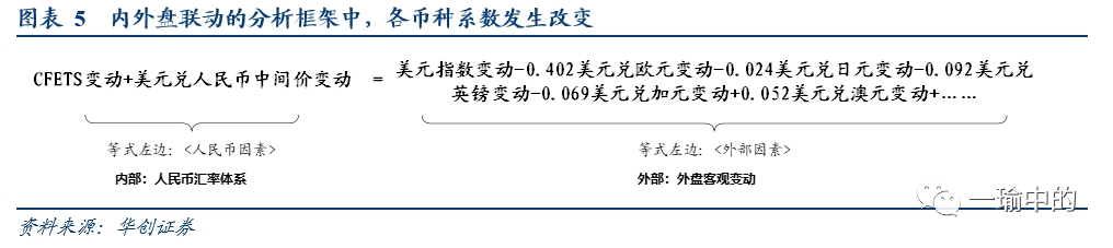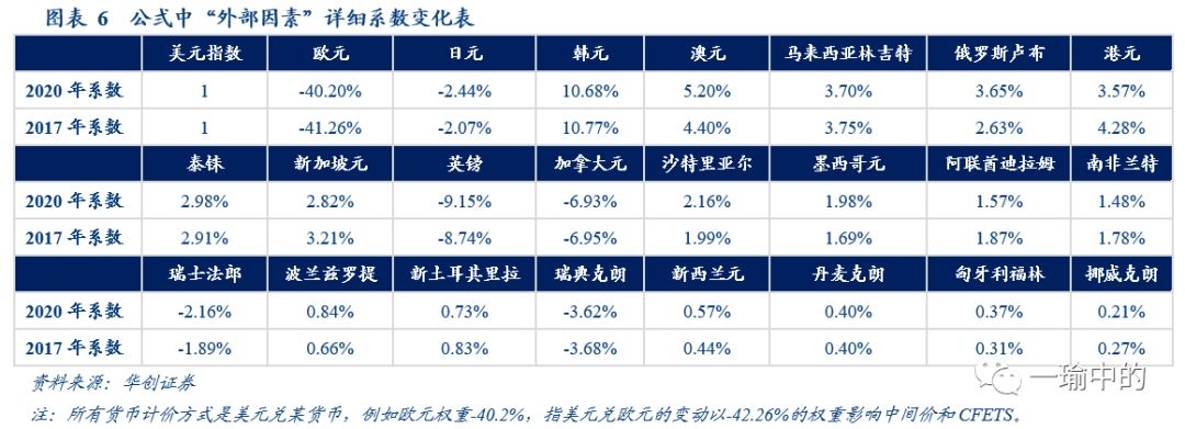 内外盘联动的分析框架中,各币种系数发生改变。根据中间价形成公式,t日中间价=t-1日收盘价+(t日维持CFETS稳定的隐含中间价-t-1日中间价)+逆周期因子。基于这一公式,不考虑逆周期因子短期变化(虽然今年破7后逆周期因子显著,但从长期看,其仍然具有波动为0的中性性质),我们利用CFETS指数编制公式,可以推导出一个“内外盘联动分析框架”,即CFETS变动+美元对人民币中间价变动=外盘各币种变动加权值。此次调整CFETS币种权重并不改变这一分析框架,但会改变外盘各币种系数,具体系数参见图表6。此次权重调整并未弱化美元波动影响。利用“内外盘联动分析框架”做进一步的分析,假设美元指数主动升值1%,即美元指数篮子内的所有货币同步升值1%,在新的CFETS系数下,人民币中间价的贬值压力为0.355%,而在旧的CFETS系数下,人民币中间价的贬值压力为0.354%,可以看到此次CFETS权重调整并未弱化美元指数波动的影响,新旧权重下美元指数升值1%对人民币中间价的贬值压力基本一致,这或也反映了调整的目的更为主要的还是应对贸易结构的变化,增强CFETS的代表性。在这里一定强调一个概念,投资者一般所关注的美元指数(比如现在96.8)是指数概念(美元兑欧元、英镑、日元、加元等六种汇率的加权指数构成美元指数,除了权重和币种不同,本质与CFETS计算方法是几乎一样的),美元指数并不是一个单一汇率概念,因此“美元升值1%,人民币兑美元镜像贬值1%”的常识感是错误的,美元指数升值幅度并不同比例对应人民币兑美元汇率贬值幅度,图表5中的公式仔细的表达了这一结论。