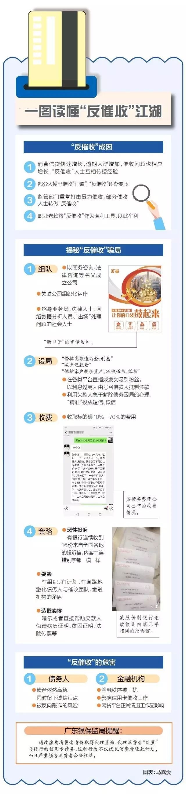 “反催收联盟”的日益猖獗引起了监管部门的注意。2019年9月2日,广东银保监局发布了风险提示称,通过虚构消费者身份取得代理资格,代消费者“处置”与银行的信用卡债务,这种行为不仅扰乱消费者还款计划,而且严重损害了消费者合法权益。