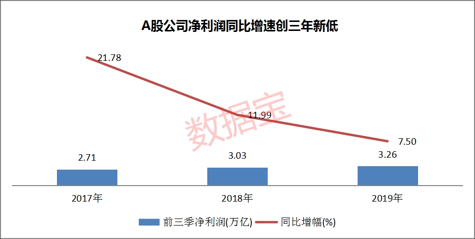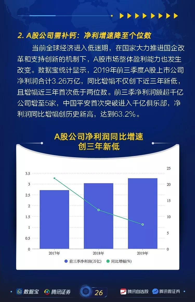 当前全球经济进入低迷期,在国家大力推进国企改革和支持创新的机制下,A股市场整体盈利能力也发生改变。证券时报·数据宝统计显示,2019年前三季度A股上市公司净利润合计3.26万亿,同比增幅不仅创下近三年新低,且增幅近三年首次低于两位数。前三季净利润额超千亿公司增至5家,中国平安首次突破进入千亿俱乐部,净利润同比增幅创历史新高,达到63.2%。