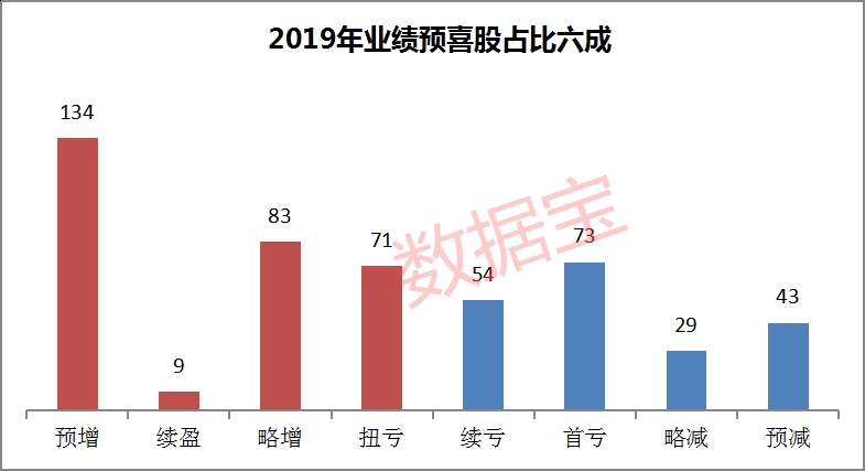 从全年业绩预告来看,目前共有590家公司预告2019年业绩类型。业绩预喜率达六成,其中预增股数量最多,达到134家,其次是略增股83只,扭亏股有71只,续盈股9只。