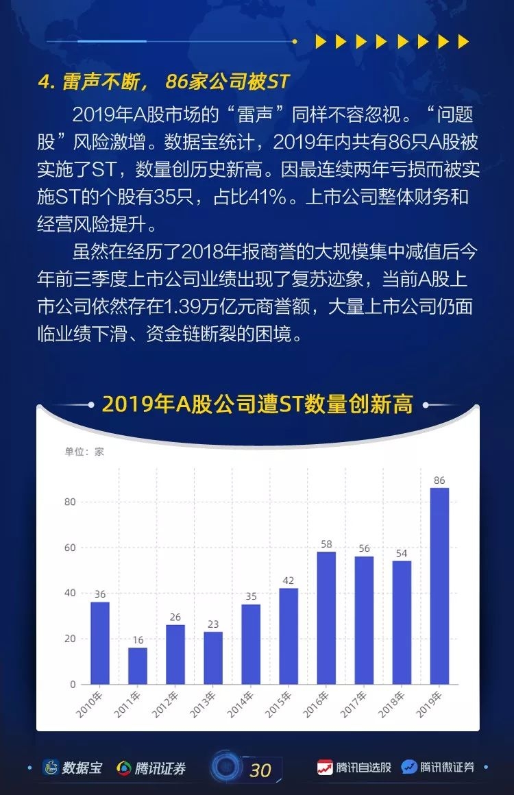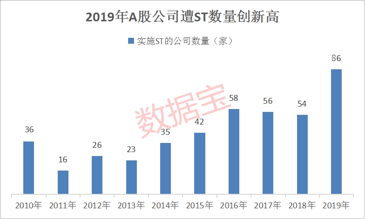2019年A股市场的“雷声”同样不容忽视。“问题股”风险激增。数据宝统计,2019年内共有86只A股被实施了ST,数量创历史新高。因最连续两年亏损而被实施ST的个股有35只,占比41%。上市公司整体财务和经营风险提升。