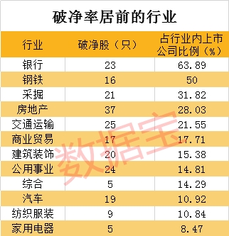 从行业来看,房地产股是破净高发地,共有37只个股上榜,破净股数量最多。从行业占比来看,银行、钢铁、采掘等行业破净率占比相对较高,其中,银行股共有24只破净,占该行业上市公司的比例达67%,钢铁行业破净率为48%。