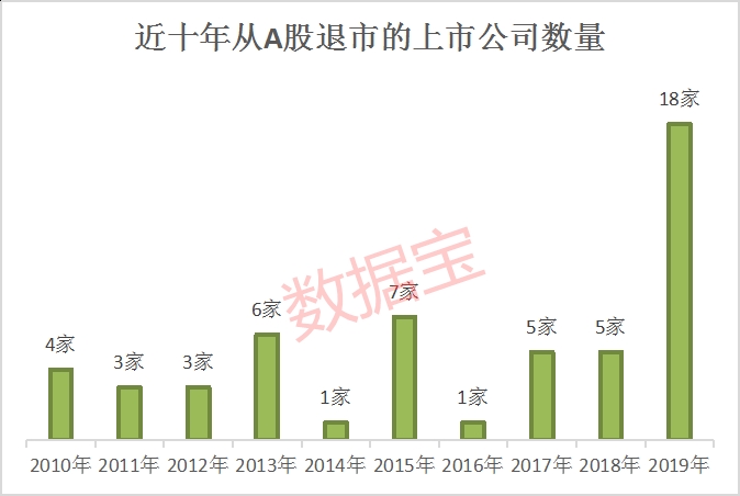 2019年共有18家上市公司从A股退市。其中主动退市1家,强制退市9家,还包括资产出退市股数量的增加与“面值退市”制度的实施密切相关。2019年因股价连续20个交易日每日收盘价低于1元引发的“面值退市”的个股已有雏鹰退、印记退等6家。此外,长生退、*ST康得、千山药机等公司因重大违法退市或面临退市,众和退、华泽退、退市海润公司因财务问题而退市。
