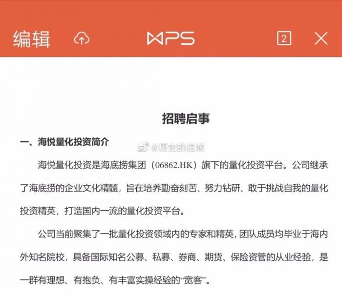 1月3日晚间,微博知名财经博主“历史的进城”发布的一则消息显示,海底捞集团旗下量化投资平台——海悦量化投资正在市场上招兵买马。