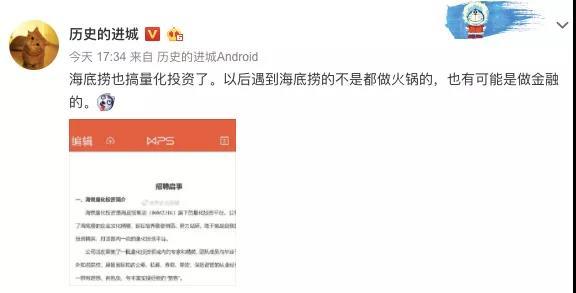 早在10月就有网友称,猎头正在帮海底捞招聘做量化投资的人。