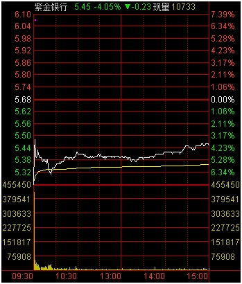 当日开盘,紫金银行大跌7.39%,开盘仅仅一分钟,成交额便超过2亿元。经急速拉升再回落后,紫金银行股价在5.40元附近横盘。截至收盘,紫金银行报5.45元,跌幅4.05%,成交金额8.26亿元,换手率8.77%。