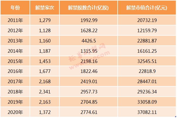 Wind统计数据显示,2020年A股共有1372家次解禁,解禁规模达到3.71万亿元,再度刷新历史新高,解禁股总数达2774.61亿股。