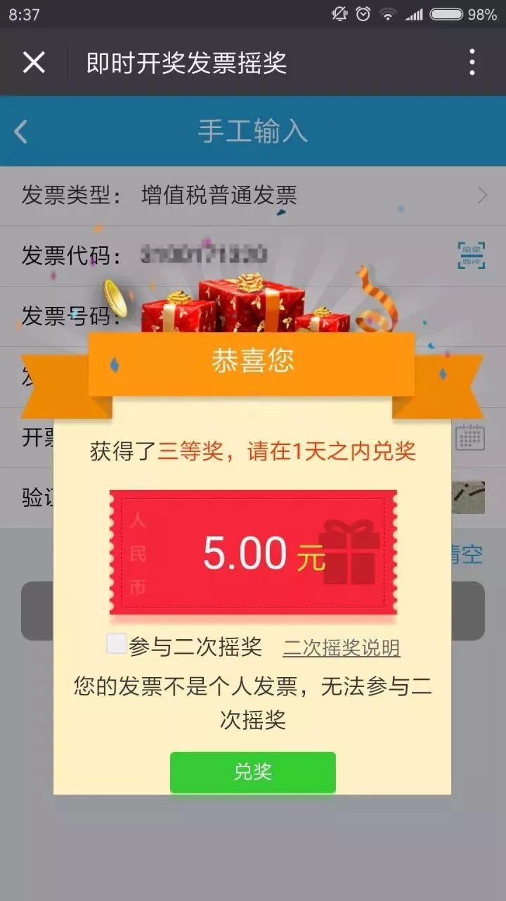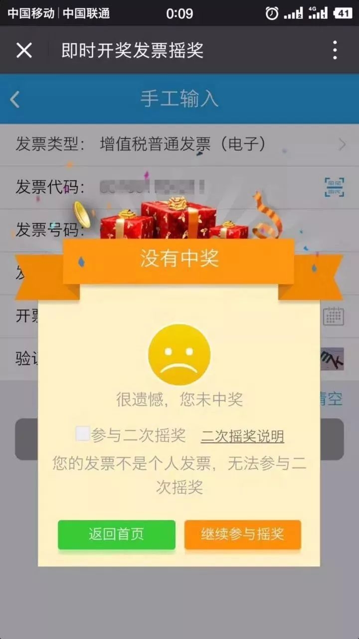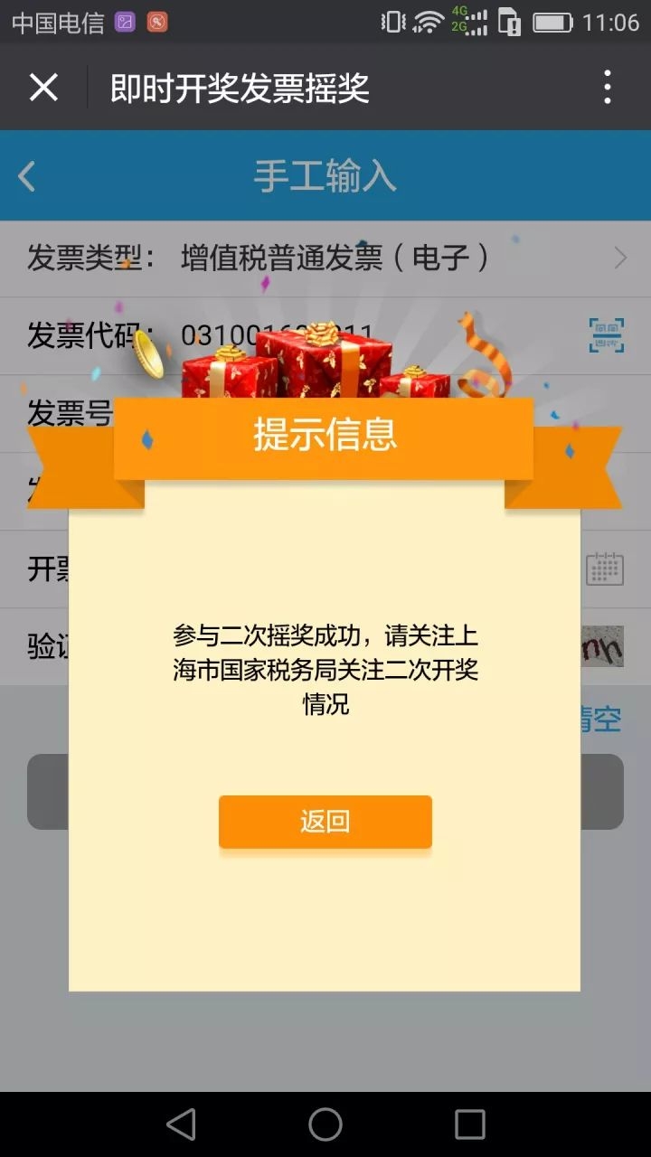 如果出现以下界面,那恭喜您中奖啦!当然没中奖的,也同样感谢您对有奖发票试点工作的支持啦!