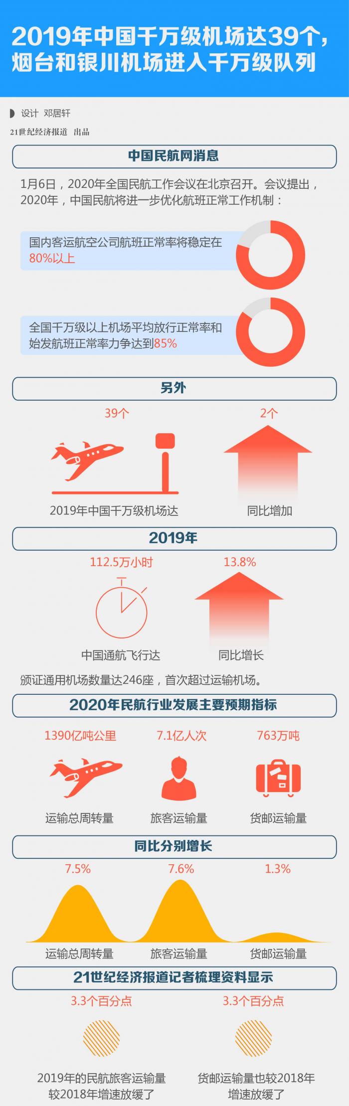 中国民航网消息,1月6日,2020年全国民航工作会议在北京召开。会议提出,2020年,中国民航将进一步优化航班正常工作机制,国内客运航空公司航班正常率将稳定在80%以上,全国千万级以上机场平均放行正常率和始发航班正常率力争达到85%;另外,2019年中国千万级机场达39个,同比增加2个。