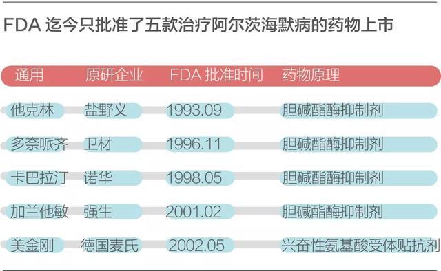 到目前为止,FDA总共只批准过5款阿尔茨海默病药物:他克林(1993年)、多奈哌齐(1997年)、卡巴拉汀(2000年)、加兰他敏(2001年)、美金刚(2003年)。其中他克林在上市后,因为副作用过大停止销售,2014年多奈哌齐和美金刚的联合疗法被批准。