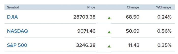 截至周一收盘,道琼斯工业平均指数上涨68.50点或0.24%,报28703.38点。标普500指数上涨0.35%,报3246.28点。纳斯达克综合指数上涨0.56%,报9071.46点。而上周五,道琼斯指数收盘下跌0.81%,盘中跌幅一度超过300点,是近一月来表现最差的一天。