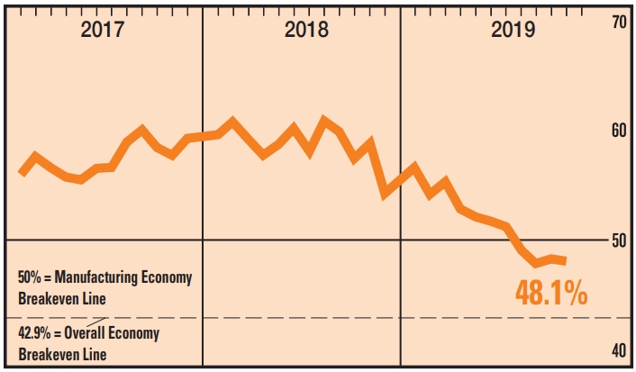 美国供应管理学会1月3日发布的最新数据显示,12月美国制造业采购经理人指数(PMI)从11月的48.1降至47.2,为2009年6月以来最低水平,特别指出美国制造业活动上个月(2019年12月)的萎缩幅度为十年来最大。新订单和就业分项指数均处于多年低位,不佳数据打击了人们对于制造业萎缩步伐放缓的预期。