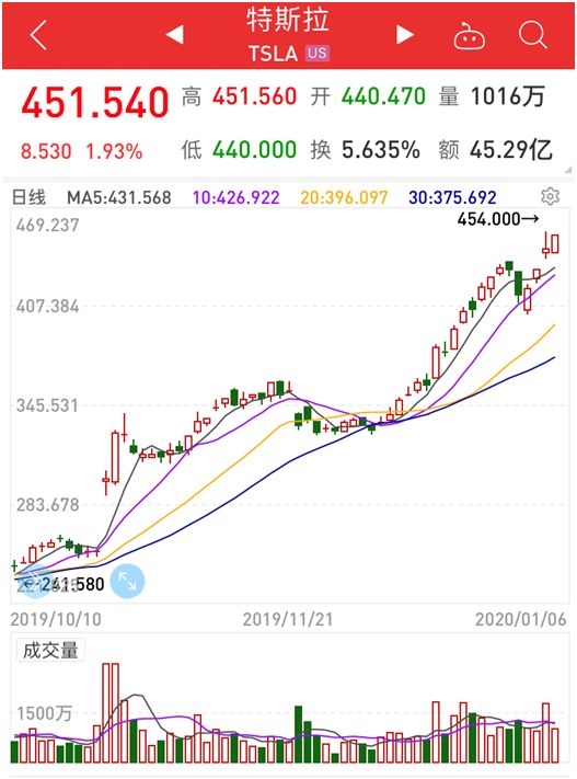 受此影响,特斯拉1月3日股价创历史新高至454美元,总市值超800亿美元,而2019年全年特斯拉振幅高达77.6%。