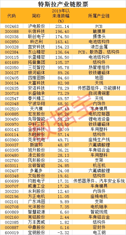 证券时报·数据宝整理特斯拉相关产业链企业发现,自2019年初至今,涨幅最大的个股为沪电股份,涨幅高达231.14%;涨幅超过1倍的个股多达8只;其中包括东山精密、先导智能、三花智控、四维图新、宏发股份等行业龙头均为特斯拉产业链企业。