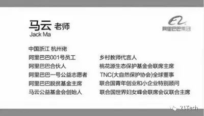 从被广泛流传的一张名片上可以看出,马云给自己贴了不少标签,其中大多数跟教育和公益有关。他是这么想的, 一直以来也是不遗余力地这么做了。