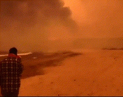 “风势很猛,到处都是灼热的灰烬,充满了烧焦的味道,还时不时传来煤气罐爆炸的巨响。天空一片血红,我们都吓得要命。”