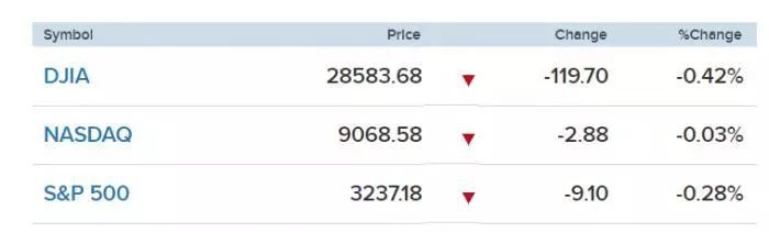 截至收盘,道琼斯工业平均指数收跌0.42%,跌幅119.70点,报28583.68点;标普500指数回落0.28%,报3237.18点;纳斯达克综合指数收于9068.58点,跌0.03%。