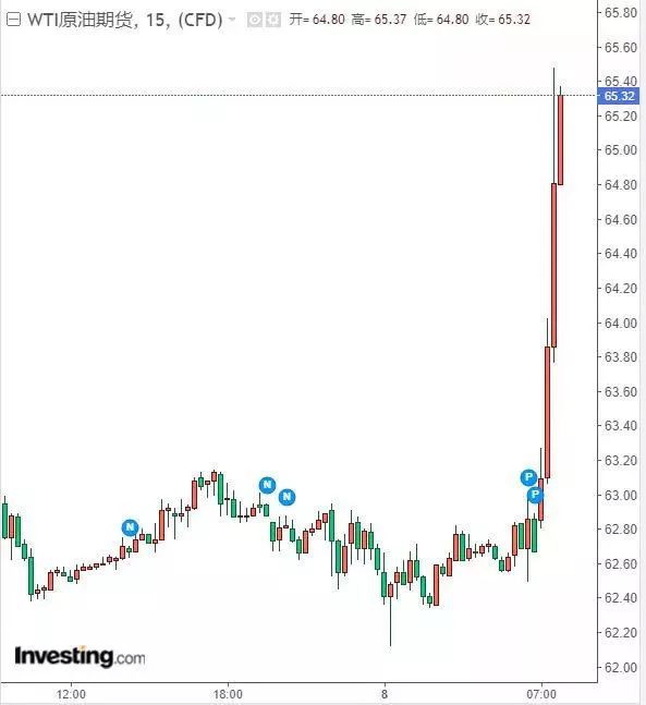 美国西德克萨斯中质原油期货价格截至发稿飙升4%或2.51美元,至每桶65.21美元,创下4月以来的最高水平,盘中高点升至65.48美元。