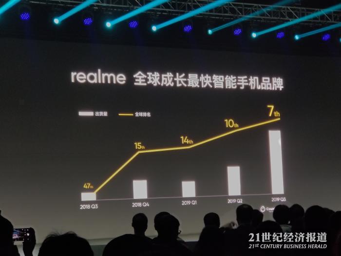 realme成立于2018年5月,此后快速占领了市场,并在2019年5月宣布进入国内。此次发布会上,李炳忠援引第三方调研机构Counterpoint的统计表示,realme在2019年第三季度开始位列全球出货量Top 7,已经进入全球22个市场,全球出货量突破2500万台,相对2018年,同比增长500%。