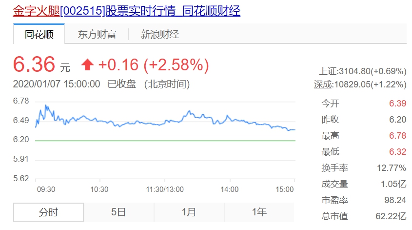 1月7日,金字火腿上涨的势头还在延续,截至下午收盘,涨2.58%。