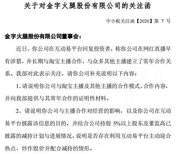 1月3日晚间,深交所围绕上述回复向金字火腿下发关注函:要求金字火腿说明与淘宝主播及其他主播的合作模式、合作内容,并提供与主播常年合作的证明性材料。