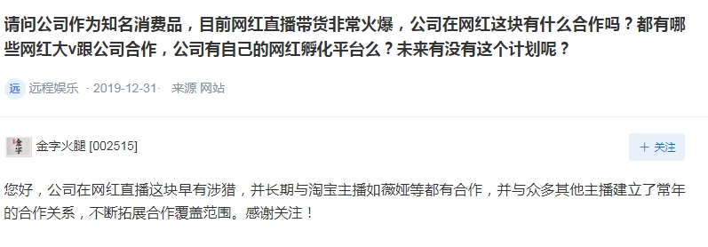 其实,几天前,金字火腿便在互动易平台回复投资者称,公司在网红直播领域早有涉猎,长期与淘宝主播薇娅等人合作,并不断拓展合作覆盖范围,与众多其他主播也建立了常年合作关系。