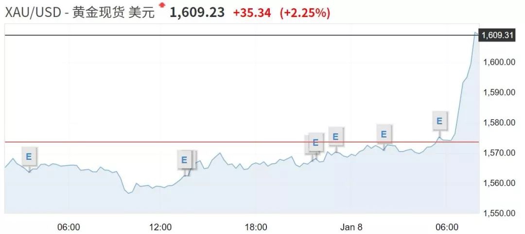 现货黄金早盘持续攀升,最高升至1600美元/盎司,涨幅扩大至近1.6%,刷新7年新高。